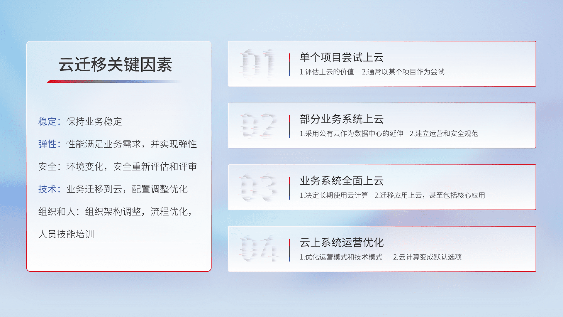 结合实际业务,,,,从规划设计、、、、云平台选型、、云原生改造、、数据迁移、、、、集成交付,,迁移全过程为客户识别最佳上云路径,,做好风险识别管理,,设计网络架构、、身份权限、、安全审计合规、、操作审计、、、、日志审计、、、、监控告警策略、、、、多站点容灾设计等,,,,对云上基础设施进行整体规划,,,提升IT治理水平,,,以满足弹性、、高可用、、高性能的需求。。。。